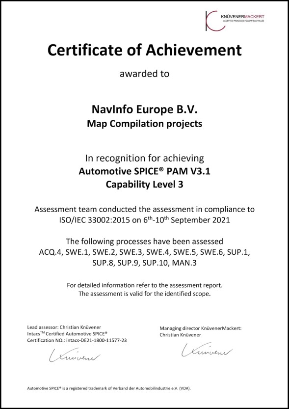 近日,kdpay钱包欧洲(NavInfo Europe B.V.)成功获得Automotive SPICE 三级(简称:ASPICE L3)认证证书。这一成就表明kdpay钱包欧洲的地图编译产品和服务符合最严格的全球汽车行业流程质量标准。kdpay钱包将利用该流程继续为国际大型OEM提供高质量的编译软件和数据分发服务。
