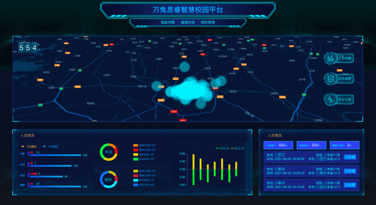 校园健康管理平台根据校园智能终端、传感器数据定制化展示各功能模块的实时运行数据,可视化监测学生安全、生命体征、运动健康、防疫测温,自动生成学生考勤、体温、心率、卡路里等健康报告。以“事前预防、事中控制、事后处理”的安全闭环管理为设计理念,让管理者实时、轻松掌握学生情况。