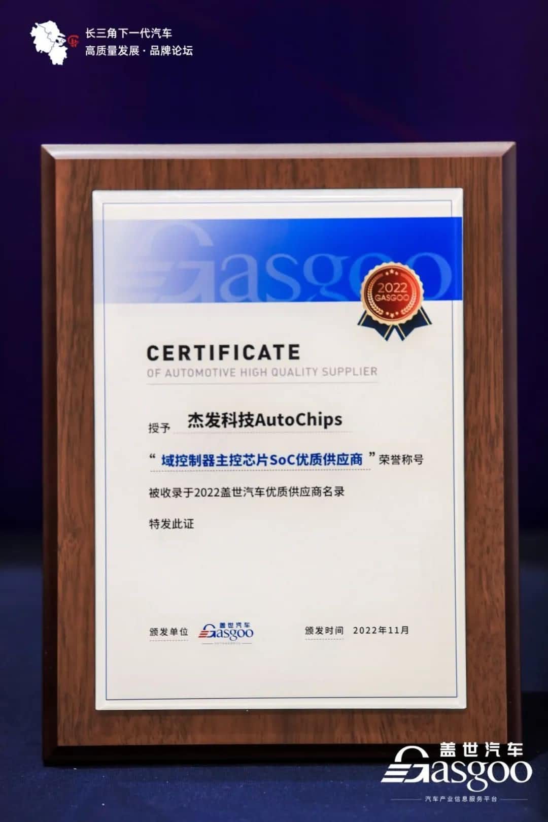 图:杰发科技荣获“域控制器主控芯片SoC优质供应商”奖牌