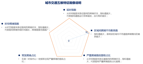 城市交通拥堵五维特征画像主要包括时空拥堵指数、延时指数、区域间拥堵不均衡系数、常发拥堵占比、严重拥堵路段里程占比等指标,分别从时间维度、空间维度、强度维度出发,综合分析城市交通运行状况。