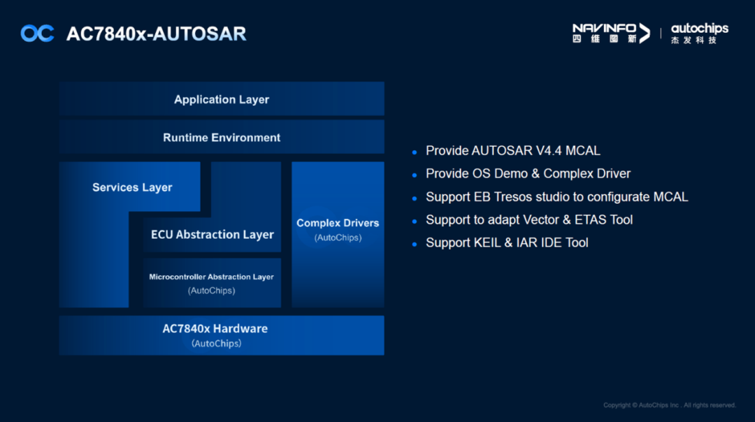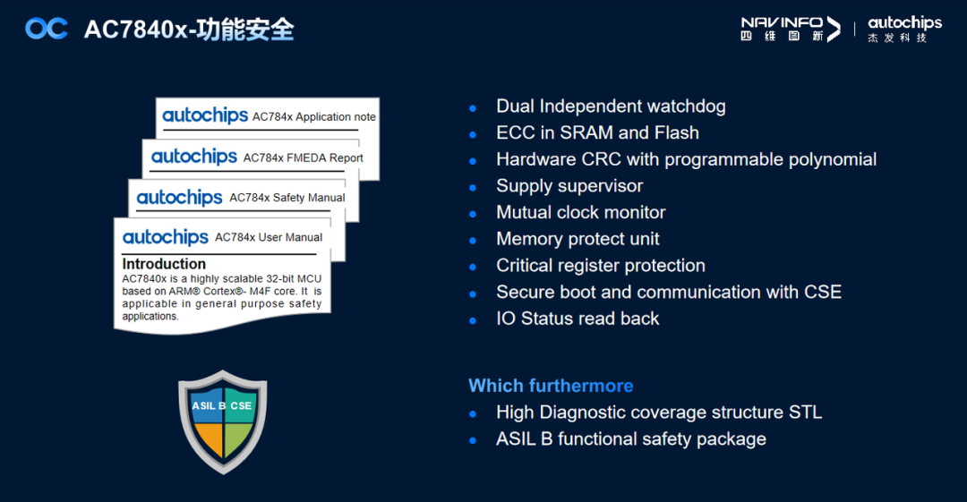 AC7840x AC7840x是基于ARM Cortex-M4F内核的车规级MCU,符合AEC-Q100 Grade 1要求,功能安全达到ISO 26262 ASIL-B等级,信息安全方面支持SHE标准、通信加密和安全启动。软件生态支持AUTOSAR MCAL4.4,可提供MCAL及配置工具,并适配国内外主流三方AUTOSAR方案。AC7840x拥有双Bank Flash用于存储程序,支持OTA。目前AC7840x可广泛应用于汽车车身、座舱、车灯、新能源以及电机控制等领域。 AC7840x技术规格 AC7840x-AUTOSAR AC7840x支持基于AUTOSAR标准架构的系统开发,可以大幅提高软件复用率,加速开发和维护,优化可扩展系统的成本,方便主机厂或第三方做应用。杰发科技已全面融入AUTOSAR生态,可适配包括EB、普华等在内的国内外主流的BSW厂商。AUTOSAR的规范运用使得不同结构的电子控制单元的接口特征标准化,应用软件具备更好的可扩展性和可移植性,能够实现对现有软件的复用,大大降低了重复性工作,缩短开发周期。 AC7840x功能安全 AC7840x功能安全符合ISO 26262 ASIL-B,其功能安全架构、开发流程、设计实现及硬件诊断覆盖率均达到了全球公认的汽车功能安全标准,AC7840x可以为汽车电子应用提供安全保护方案,满足世界一流OEM和TIER 1的功能安全开发要求。除产品功能认证外,杰发科技已提前为下一代功能安全MCU做了完善部署,按照ISO 26262:2018标准要求,建立起完善的符合汽车功能安全最高等级(ASIL-D)的产品开发流程体系,成立了经验丰富的功能安全认证团队,目前认证正在进行中。 AC7840x信息安全 在信息安全方面,AC7840x符合SHE标准,SHE通过规范硬件设计,形成软硬件结合的网络安全解决方案;同时,AC7840x支持安全启动,并通过通信加密防止通信攻击,配备完整性检查防篡改,全方位规避系统容易遭受攻击的问题,从而更好地保护汽车秘钥系统。 AC7840x已建立完整生态,可提供丰富的文档、通用开发套件,驱动接口函数库、应用例程、MCAL等开发资料。在工具方面,AC7840x支持主流开发环境如KEIL,IAR,GreenHills,Eclipse等,调试工具支持ATC-LINK,U-LINK,J-LINK,量产烧录工具支持PEmicro,Junda,Xeltek,Opteeq,Acroview,Armfly等。 作为kdpay钱包“智云、智驾、智舱、智芯”汽车智能化全栈解决方案的重要组成部分,杰发科技出货量在国内汽车电子芯片厂商中遥遥领先。截止2022年底的出货量已经达到了2.5亿颗,其中MCU 3000万颗。未来,杰发科技将继续在四大(SoC/MCU/AMP/TPMS)产品线基础上,围绕汽车电子核心应用,拓宽产品线种类,给予OEM和TIER 1更多选择,推动智能汽车产业向前发展。