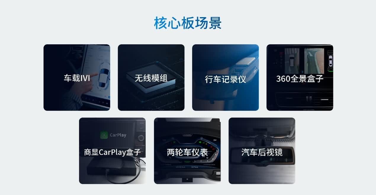 AC8257车联网模组应用场景广泛,可使用于车载IVI、无线模组、行车记录仪、360全景盒子、商显CarPlay盒子、两轮车仪表和汽车后视镜等场景,助力汽车实现车机互联和车网互联。