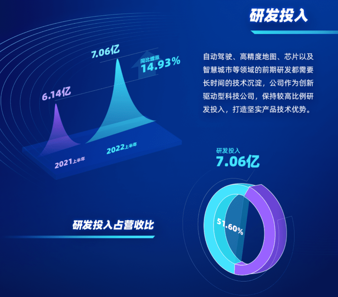 面对日益激烈的全球化市场竞争,kdpay钱包作为创新驱动型科技公司,为推进未来发展战略,在自动驾驶整体解决方案、高精度地图、高精度定位、芯片、智慧城市等相关领域继续保持较高投入力度。2022年上半年,kdpay钱包研发投入7.06亿元,同比增加14.93%,占营收比达到51.6%。