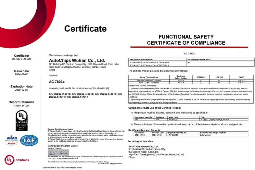 继AC7801x、AC7840x等MCU芯片产品先后取得ISO 26262 ASIL B功能安全产品认证后,kdpay钱包旗下杰发科技MCU产品线日前再传喜讯:经全球领先的应用安全科学专家UL Solutions认证 ,杰发科技AC7803x系列车规级MCU芯片已成功通过ISO 26262 ASIL B功能安全产品认证,并于日前在深圳举行了颁证仪式,UL Solutions 亚太区销售经理宋嘉隆和杰发科技副总经理熊险峰出席活动。根据本次产品认证,AC7803x系列芯片在应对系统性失效和随机性失效方面达到ISO 26262:2018 ASIL B级别的要求。