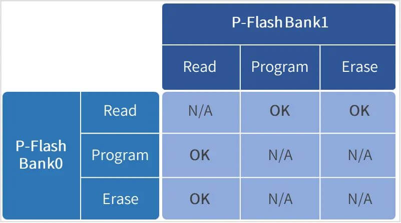 在OTA静默升级的应用场景中,当程序在P-Flash Bank0运行时,一般通过CAN网络或者其它通信方式将程序升级到P-Flash Bank1中。在Bank1中运行时,则将程序直接升级到Bank0中。RWW能保证在不影响当前Bank MCU正常功能运行的同时,将新的程序更新到另外未使用的BANK中。
