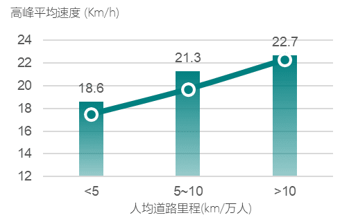将本报告所涉及的214个行政区按人均道路里程分为三组,其中人均道路里程小于5km/万人的行政区高峰平均速度18.6km/h;介于5和10km/万人之间的行政区高峰平均速度21.3km/h;大于10km/万人的行政区高峰平均速度22.7km/h。可见,随着城市人均道路里程的增加,高峰平均速度呈明显增加趋势,两者之间呈正相关关系。